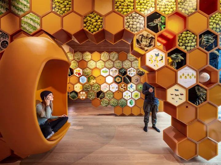 What appears as a small, wooden building on the outside transforms into a thriving beehive on the inside through integrated architecture and scenography. Gigantic honeycombs made from a material mimicking wax split the interior into different sections. Two large cells resemble a queen larva’s gestation cell. In these cells, you can lounge, listen to stories, and consider new perspectives about nature and its preservation as your knowledge expands.