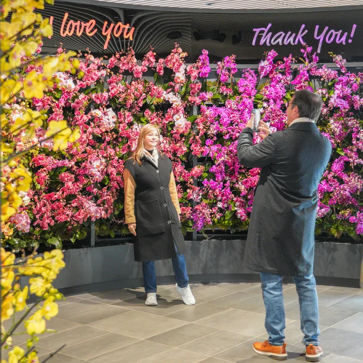 Almost everyone visits Keukenhof to capture the beauty of the flowers. That’s why the ‘selfie culture’ is given plenty of room in the pavilion. In the center of the spaces, we placed massive installations with stunning plants and perfect lighting. These are the ideal photo spots. Because they are centrally located, people can pose freely without blocking the flow for others.